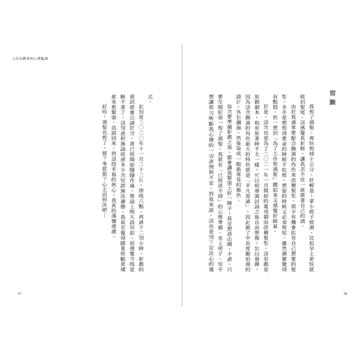 〈完成版〉 對於我這種成天緊張兮兮又神經質的人而言,走入這一行根本像接受一連串震撼教育。每天有好幾次忍不住想,又因為心情緊張少活了幾歲。其中,對心臟造成大負擔的就是看到「完成版」時。 完成版,指的是經過編輯、修剪之後,進入完成階段的影音作品。在業界,我們多半用這個詞彙來稱呼電視連續劇的完整影片,通常會在播映之前收到。因此,一旦接近正式播映日,我就開始預測,老想著搞不好就是今天,完成版影片差不多該送來了吧?就快收到那個用粗體字寫著「上白石小姐收」的小小信封了。 可惜的是,我的直覺多半都失靈。每次提心吊膽想著「一定是今天!」結果大概是隔天或再隔一天。唉,這就是人生吧。 對了,演員面對完成版影片通常分成兩類,一種會看,一種收到後也不看。我屬於會看的,原因是我已經事先做好心理準備,希望在作品問世之前能先確認過,以便調整好自己的節奏。 好啦,只要收到影片,我就坐立不安。無論當天拍攝工作到多晚結束,或是隔天得多早起床,總之一旦收到這玩意兒,我就沒辦法擱著不管。一回到家,匆匆洗手、漱口之後,連衣服都等不及換下就直衝客廳。打開電視以及DVD播放器的電源,放進光碟。等待讀取的過程中,迅速換好居家服,就定位並且深呼吸。按下播放鍵之後,接下來就是一個人專屬的反省大會。 老實告訴大家,其實第一次看到自己的作品完全搞不懂。雖然這些年來有幸接觸這麼多作品,卻從來沒能單純以旁觀的心態來看。別說自己出現的場景,就連看到其他人的演出時,每次仍不免為我個人的笨拙演技感到沮喪,深切反省。同時,看著畫面也不禁感受到導演以及其他劇組人員的莫大助力,真的非常感謝。哎呀我好糟糕,哇太感謝大家了。就在這兩股情緒間來回擺盪。 最麻煩的是即使看過完成版影片,也不代表能夠放心迎接正式播出,反倒還比看之前更害怕了。雖然宣傳時面帶微笑說著,「今晚播出,請按時收看!」內心總是七上八下,忐忑不安。 〈朗讀〉 今天我去錄製國語教科書的朗讀CD。去年是小學課本,今年錄的則是中學課本。對於曾經合作的單位再度向我提出邀約,真的很開心。何況朗讀課文這樣的工作內容,對身為「教師之女」的我而言,實在無比幸運。 這次更榮幸的是,我負責朗讀的內容竟然是唸中學一年級時最喜歡的課文──谷川俊太郎的〈早晨的接力〉。就在我一唸出聲之後,當年的記憶不斷湧現。有甜美,也有辛酸。哇!沒想到中學時的回憶竟然如此撩動人心。 還記得那時候,我一心一意試圖保持低調,滿腦子想的都是「拜託,每個人都別看我!」 唸小學時,我在墨西哥住過三年,當時全身散發出「大家看過來!」的拉丁魂,回國之後在六年二班的教室裡,依然故我,顯得特別突出。即使級任老師很欣賞這一點,還告訴我,「上白石,妳就這樣保持下去吧!」對我而言也起不了作用,後來我馬上變回日本人。等到要上中學時,我大概是全班最拘謹、最低調的人。 對當時的我而言,最鬱悶的就是國語課時的朗讀。因為,我太喜歡朗讀了! 因為喜歡,好想盡情朗讀,可是又不想成為眾人矚目的焦點。於是,我選擇和其他人一樣,迅速且低聲讀過去。天曉得在心裡根本對這樣的自己厭惡極了!那時候真的好窩囊! 全班大概只有兩名同學會口齒清晰唸出聲音,我卻無法和他們一樣落落大方,反倒拚了命想混入多數人之中。 回想起來,教室真是個「恥力聚集地」。在正值青春期的一群人之中,說出自己真正的喜好需要極大的勇氣。尤其像我這種膽小鬼。 想想那時候無論面對什麼事都好辛苦啊。真想輕撫著當年那個自己的背,然後告訴她,等妳長大之後會因為工作關係有很多朗讀的機會唷! 〈交流〉 直到最近,才知道有個朋友和我住得很近。我們是同一所高中的同學,雖然從來沒同班過,感情卻莫名地好。 因緣際會,本來提議「不如來通信吧!」就在彼此交換地址時忍不住大笑,「欸!等一下!我們直接碰面比較快啦。」這才發現住得好近。 從那次之後,我們不時會約了散散步,或是互相分送一些家裡多的東西。 今天也是,對方突然捎來訊息問我:「要不要吃文旦?」然後約好十分鐘後在附近的公園碰面。正當我把幾顆當作回禮的橘子塞進紙袋時,手機又傳來對方的訊息:「我們這樣好像『動物森友會』哦(笑)」 哇!真的耶!上次是蘋果換柿子,今天是橘子換文旦。我趕緊帶著水果出門,交換之後散步閒聊一會兒便道別。這不就是心目中理想的悠閒生活嗎!就算沒到森林裡,但是在東京竟然能和鄰居有如此溫馨親切的交流,真是美好。 希望有一天能端著整鍋馬鈴薯燉肉之類的料理去跟對方交換,然後約好下次她要還我一整鍋的豬肉味噌湯。 目送著她把橘子放進自行車前方的置物籃,瀟灑離去的身影,我的臉上忍不住泛起微笑。看來,又多了一個短期內不會搬家的理由。 〈剪斷〉 我剪了頭髮。爽快剪掉十公分,好輕盈~拿小梳子梳頭,比起早上更快就梳到髮尾,這感覺真新鮮,讓我忍不住一直摸著自己的頭。 由於我通常要配合飾演的角色來改變髮型,很少有機會能有自己想要的髮型。多半是想剪得要命的時候不能剪,想留的時候又必須剪短。雖然偶爾覺得有點悶,但一想到「為了工作剪頭髮」聽起來又感覺好帥氣。 於是,這次也是為了二○二一年一月開始的電視劇而改變髮型。這部戲是原創劇本,和有原著時不太一樣,可以和導演討論