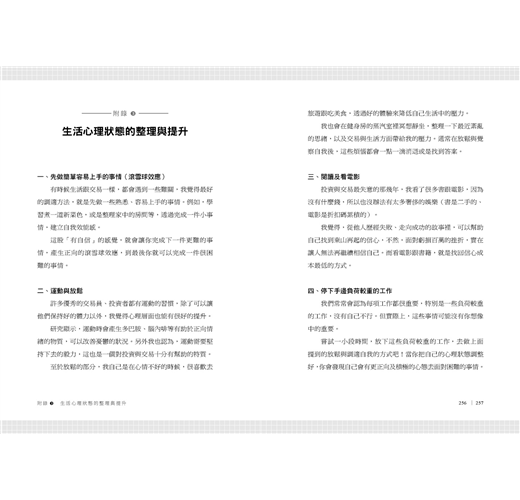 本書的第14、15章,也會提供你改善交易心理的實用方法,讓你能透過心理目標的設定,以及一些認知行為的心理學方法,提升交易時的心理素質,並幫助你在遭遇重大虧損、交易低潮時,能夠更好地調適壓力。