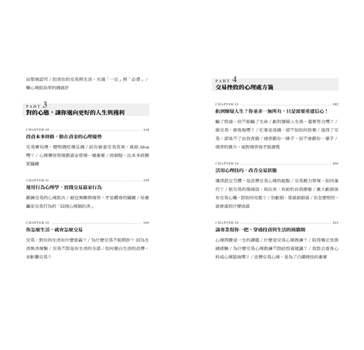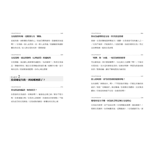 心理困擾是一生的課題/什麼是交易心理教練?/取得矯正性情緒經驗/為什麼交易心理教練不該給投資建議?/我該去身心科與心理諮商嗎?/改善交易心理,是為了凸顯理性的重要