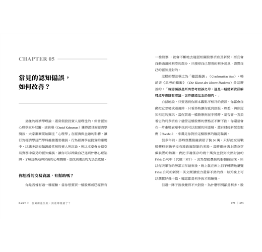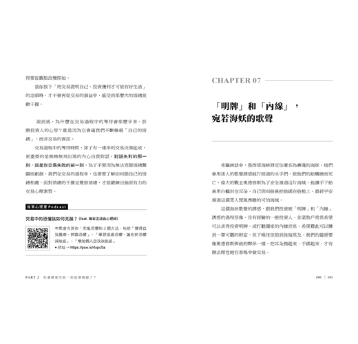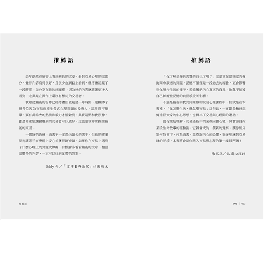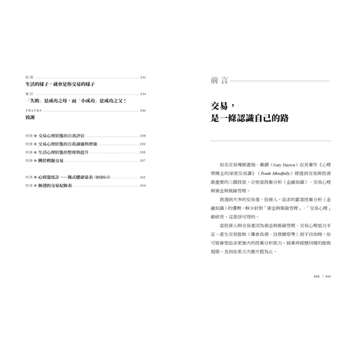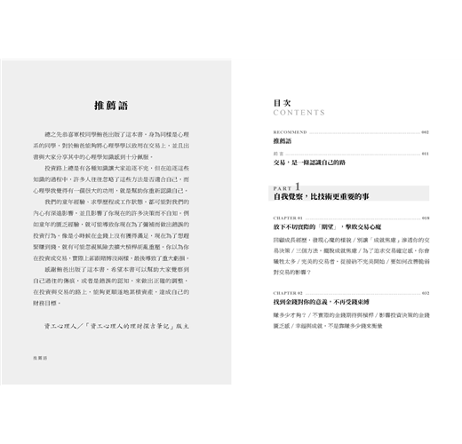 但如果你想更多地了解交易心理,相信你能從本書中,得到許多深入淺出的交易心理、投資心理知識,從個人心理層面的成就焦慮、金錢焦慮與情緒調控,到關係中的家庭影響、社會比較,最後還有在交易實務中常見的認知偏誤、個人交易策略與心理狀態的適配性等。
