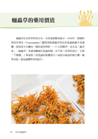 ★詳列蛹蟲草的活性成分分析與藥理作用,說明對於人體的保護功效與改善各種疾病的能力,包括對於中樞神經系統、心血管系統、呼吸系統、內分泌系統、免疫系統及抗腫瘤等,均已證實有明顯的裨益。