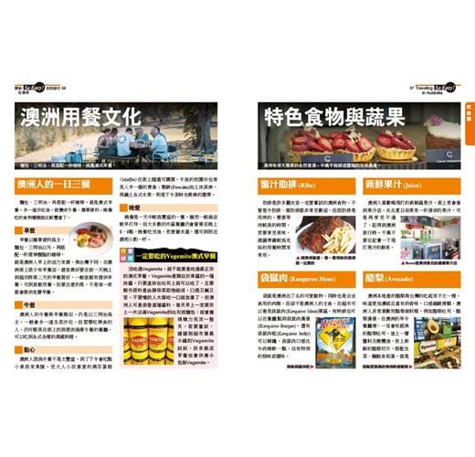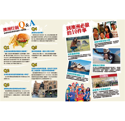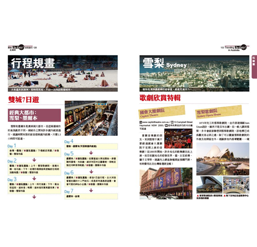 提供各大城5日遊,及親子共遊、深度行程等主題式規畫,還有雙城7日遊安排:雪梨+墨爾本、雪梨+坎培拉、布里斯本+黃金海岸、墨爾本+塔斯馬尼亞,不但細心說明早、午、晚各時段的踩點內容,或搭渡輪或悠閒漫步,更搭配動物園、國家公園等一日遊在內,讓你輕鬆安排出最適合自己的行程!
