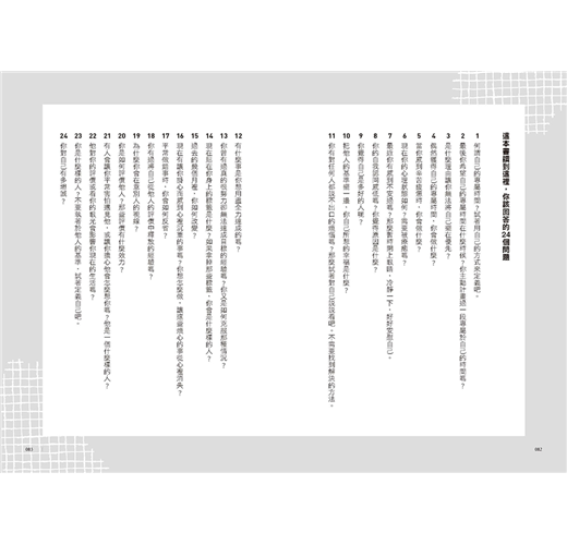 我建議不要一次把這本書讀完,而是回答章節與章節之間的問題,給自己時間將這本書的教訓應用在自己的生活中。將剛剛讀到的內容反覆咀嚼,並回頭看看自己的想法如何。