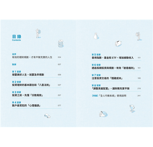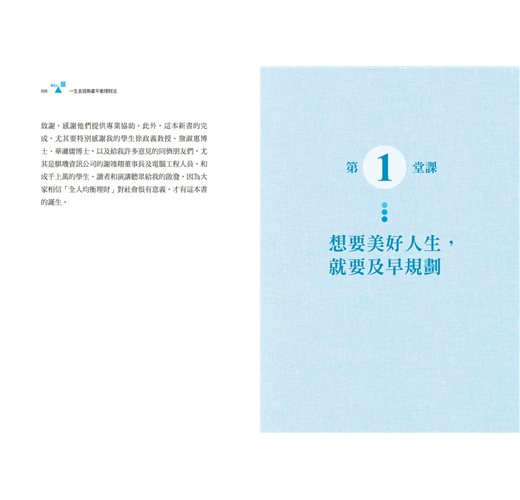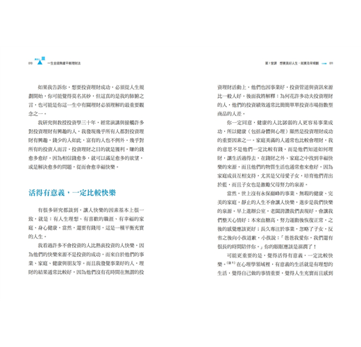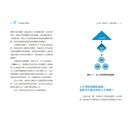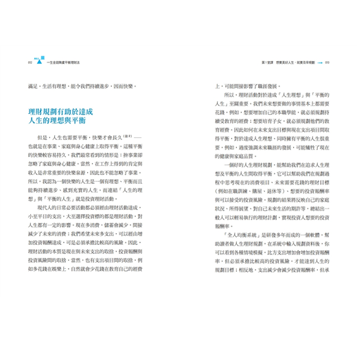 事實上,理財的背後,代表的是人們想要追求平衡充實的渴望,包含能實踐人生的理想、工作上有成就感、家庭生活幸福,以及身心靈的健康等。想要這種富足與幸福快樂的人生,徒有想法不夠。透過「全人均衡系統」的核心 8 堂課,建立正確的一生理財規劃概念,全面升級陳舊的理財思維,大步跨入平衡充實的富足人生新境界。