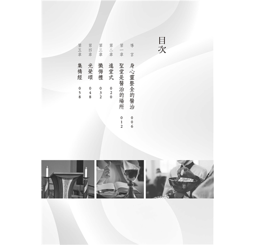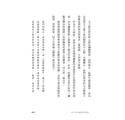 感恩聖祭是我們信仰的核心,亦是愛的聖事、共融的標記、分享的聖宴,更具有醫治的力量。本書以聖經和教會的教導為基礎,深入彌撒的各個主要部分,從聖道禮儀至聖祭禮儀,清楚說明如何領受天主豐沛的聖愛與恩寵,以獲得身心靈全人的治癒。