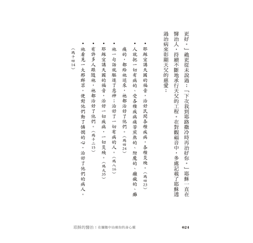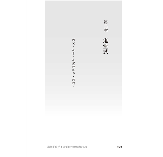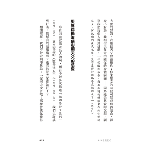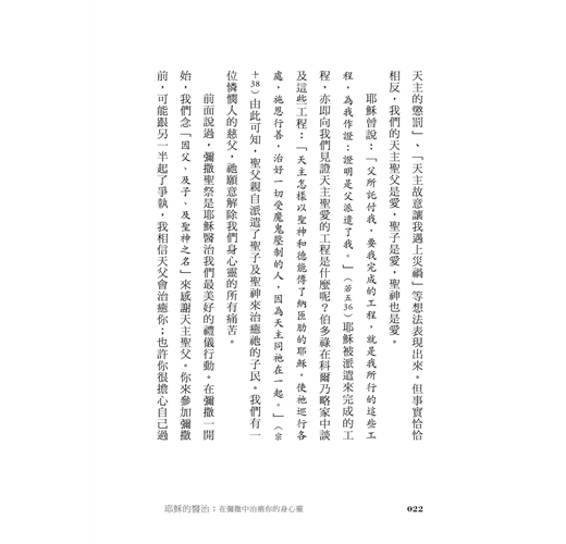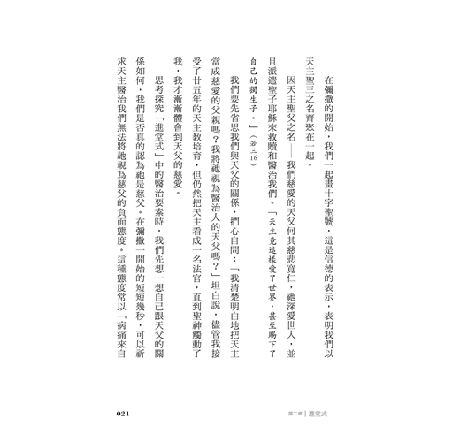 從畫十字聖號、呈獻禮品到禮成式的降福,仔細講解其中的醫治要素,幫助我們依恃和信賴天主,更積極專注、熱忱又有活力地參與彌撒,懷著虔敬的心恭領基督聖體,體會主耶穌奇妙的醫治大能。