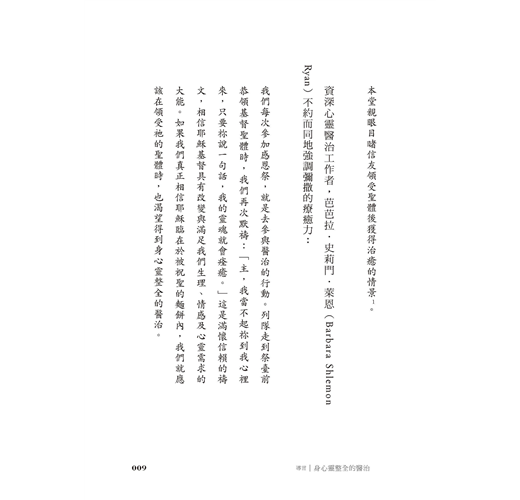 「參與感恩聖祭是天主教靈修的核心,《耶穌的醫治》內容扎實且清楚易懂,有助於認識彌撒的恩寵,體會身心靈的醫治與轉變。」──芭芭拉.史莉門.萊恩(Barbara Shlemon Ryan)/天主教作家、心靈醫治工作者