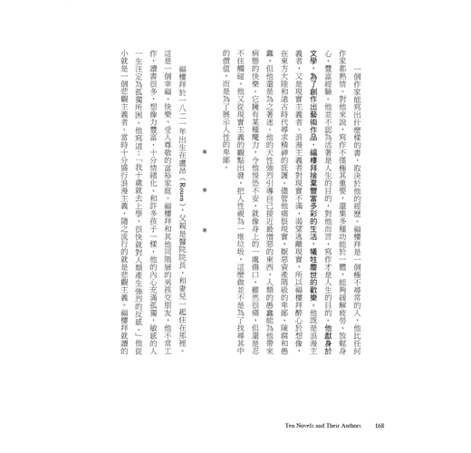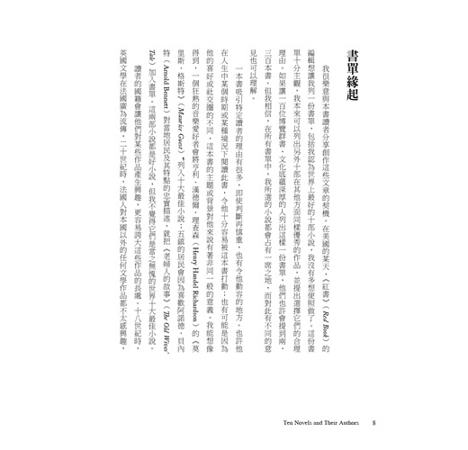 我很樂意與本書的讀者分享創作這些文章的契機。在美國的某天,《紅書》(Red Book)的編輯想讓我列一份書單,包括我認為的世界上最好的十部小說,我沒有多想便照做了。這份書單十分主觀,我本來可以列出另外十部在其他方面同樣優秀的作品,並提出選擇它們的合理理由。如果讓一百位博覽群書、文化底蘊深厚的人列出這樣一份書單,他們也許會提到兩、三百本書。但我相信,在所有書單中,我所選的小說都會占有一席之地,而對此有不同的意見也可以理解。
