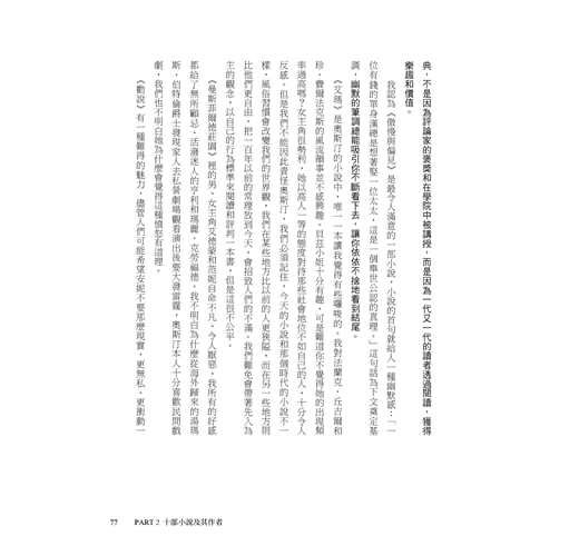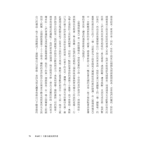 大多數的小說家都經歷起起落落,奧斯汀是唯一一個例外,她證明只有平庸的人才會一直保持在同一個水準──一個平庸的水準,她一直維持在最佳狀態。即便《理性與感性》和《諾桑覺寺》這兩本書有許多不足,但是出色的地方更多。她的其他作品也不乏忠誠又狂熱的崇拜者:湯瑪士.麥考萊(Thomas Macaulay)認為寫出《曼斯菲爾德莊園》是她最大的成就;有一些同樣傑出的讀者更喜歡《艾瑪》;班傑明.狄斯瑞利(Benjamin Disraeli)把《傲慢與偏見》讀了十七遍;現在很多人認為《勸導》是她最好的作品。不過,我相信絕大多數的讀者都認為《傲慢與偏見》是她的代表作,我們不妨接受他們的判斷。經典作品之所以經典,不是因為評論家的褒獎和在學院中被講授,而是因為一代又一代的讀者透過閱讀,獲得樂趣和價值。