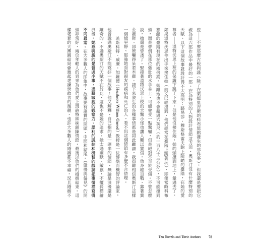 珍有一個優點,我差點忘記提了。她的作品可讀性極強,甚至超過一些更著名、更偉大的作品。她的小說中沒有什特別的事情,但是你讀完一頁時,就會急切地想知道接下來的故事。即便接下來的故事也沒什麼特別,你依然會迫不及待地翻頁。這正是小說家最寶貴的天賦。