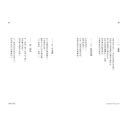 如果你覺得前面那些用楷體來標示的書中引文、那些尼采在一八八一年輕快宜人的夏日裡所說的話和作風很吸引你,那麼作為導讀者我必須負責任地告訴你,你至此所瞥見的那年夏天那個情不自禁地自我揭露的、狡獪又傲嬌、時而英雄時而丑角的尼采,都是被萬壹遵老師的譯筆給生動地再現了。讀他的譯文,我們也領受到一種知識的快樂,讓自己得以用更輕快的腳步,跟著尼采去散步,也在自己的生命裡散步――以忠於我們身上那同樣也時而英雄時而丑角的姿態。