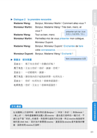 依場合分類,重點式整理各實用短句,讓你表達無障礙。接著附上與短句主題相關的2個情境會話,在會話中不時會用色塊解說生字或文法。在看完了會話與解說內容後,接著邊聽邊朗讀,對聽力與口說訓練會有很大的幫助。