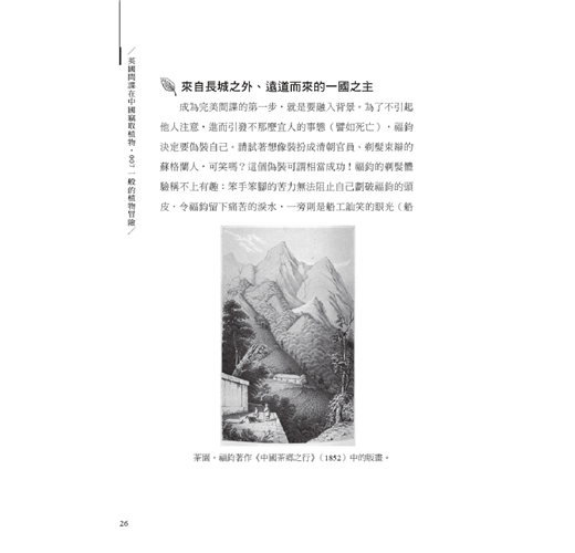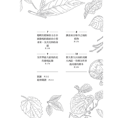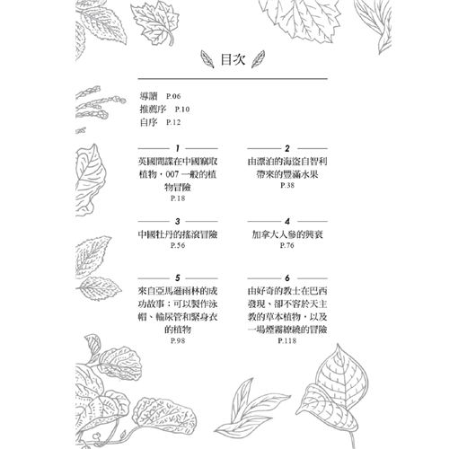 本書帶領讀者追溯諸多植物學者與冒險家的足跡,他們為了這些植物無所不用其極,有的剃髮留辮假扮中國人竊取茶葉;有些在海上漂泊許久才從新大陸將珍奇植株帶回;更有的偽造文憑當上植物學者,好將牡丹種子帶回西方。