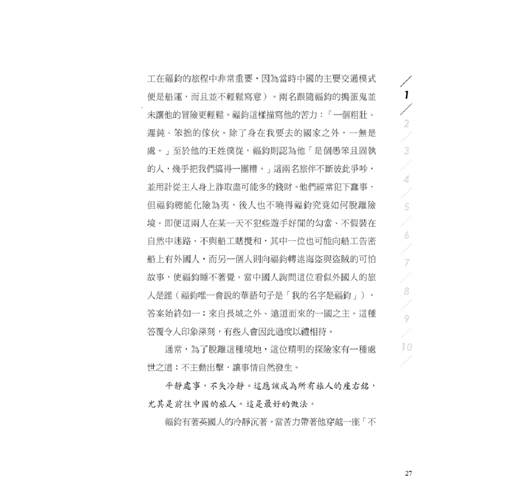 我喜愛冒險家,而且是真正的冒險家,是那些為了科學、知識和發現而踏遍世界各地的冒險家。他們不見得長得像印第安納.瓊斯的演員哈里遜.福特(Harrison Ford,1942-)或詹姆斯.龐德的第一代演員史恩.康納萊(Sean Connery,1930-2020)。但他們都是前無古人的重要人物,彷彿是小說中才會存在的人物。以福鈞為例。他肩負間諜任務,冒著生命危險前往中國的偏僻角落歷險,同時要保持英式的冷靜自持。至於萊佛士(Stamford Raffles,1781-1826),他為現代新加坡打下基礎,並為了探索自然奇觀而花上不少時間在叢林中長途跋涉。