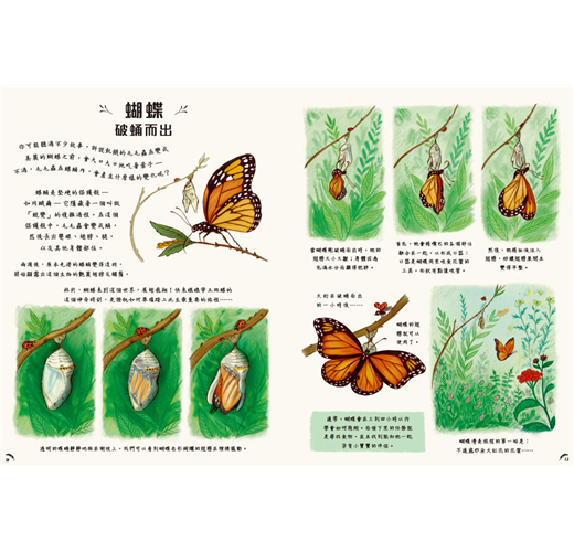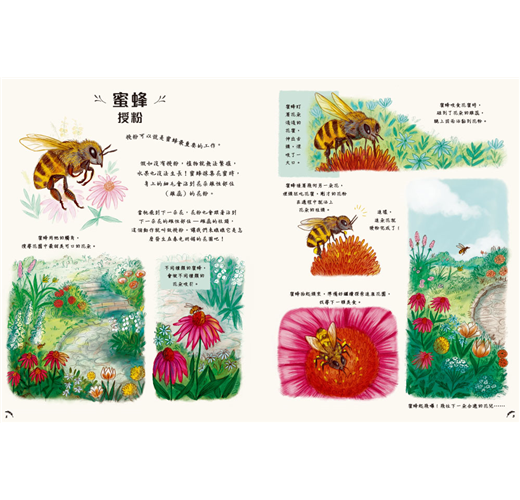 蜜蜂為花授粉、毛毛蟲破蛹成蝶、