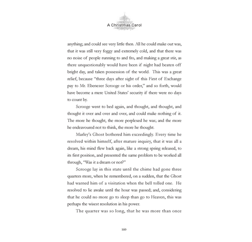 The mention of Marley's funeral brings me back to the point I started from. There is no doubt that Marley was dead. This must be distinctly understood, or nothing wonderful can come of the story I am going to relate. If we were not perfectly convinced that Hamlet's Father died before the play began, there would be nothing more remarkable in his taking a stroll at night, in an easterly wind, upon his own ramparts, than there would be in any other middle-aged gentleman rashly turning out after dark in a breezy spot—say Saint Paul's Churchyard for instance—literally to astonish his son's weak mind.