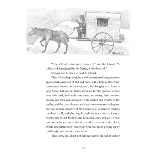 噢!但他可是一個連石頭都能榨出油來的人哪,史顧己啊!是一個用擠、用撈、用刮、用貪、用摳,無論如何都要得到好處的老狐狸!他猶如又硬又尖的打火石,沒有任何鋼棒可以從他身上打出慷慨的火花;而且,他又宛若牡蠣一般神祕、封閉且孤僻。他內心的冷酷使他老朽的軀體蒙上一層寒霜,凍傷了他尖挺的鼻樑,冰皺了他的雙頰,冷僵了他的步伐,並使他雙眼通紅、薄唇發紫,連他那沙啞的聲音說出來的話語也十分冰冷刺骨。他的頭頂、眉骨及瘦削的下巴上,都覆蓋著白皚皚的寒霜。那股寒意總是與他如影隨形,即使是盛夏,他也可以讓辦公室的氣溫降至冰點,就算是聖誕節,情形依舊如此。