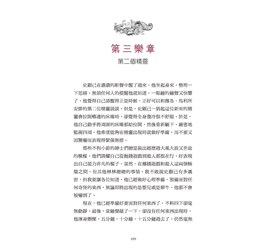 別會錯意了!我這麼說並不代表我個人特別了解死氣沉沉的門釘。其實,我倒認為棺木釘才是最毫無生氣的金屬。但是這個比喻蘊含著我們老祖宗的智慧,並非我可以妄加褻瀆竄改的,否則這個國家豈不大亂?因此,就容我再強調一次吧:馬利已經像釘死的門釘一樣僵死了。