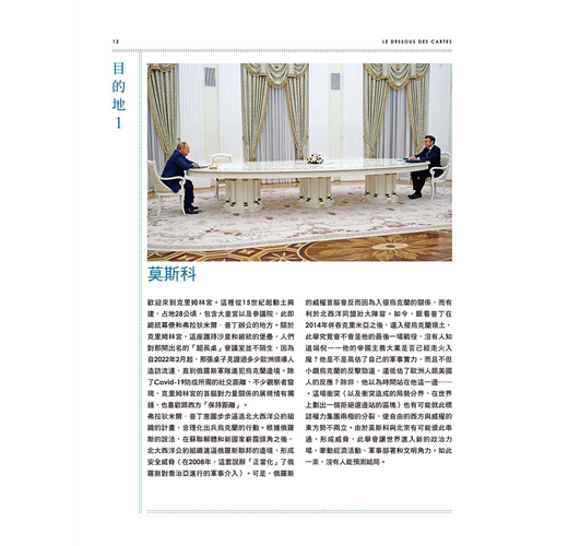 歡迎來到克里姆林宮。這裡從15世紀起動土興建,占地28公頃,包含大皇宮以及參議院,此即總統幕僚和弗拉狄米爾・普丁辦公的地方。關於克里姆林宮,這座護持沙皇和總統的堡壘,人們對那間出名的「超長桌」會議室並不陌生,因為自2022年2月起,那張桌子見證過多少歐洲領導人造訪流連,直到俄羅斯軍隊進犯烏克蘭邊境。除了Covid-19防疫所需的社交距離,不少觀察者發現,克里姆林宮的首腦對力量關係的展現情有獨鍾,也喜歡跟西方「保持距離」。