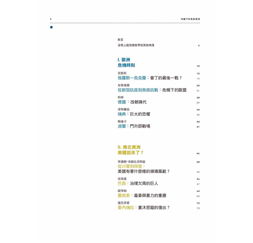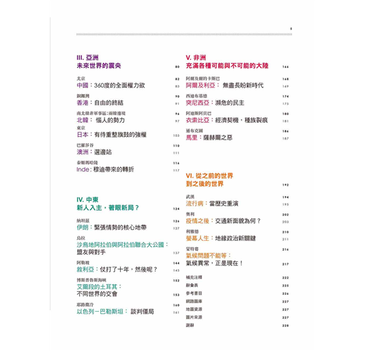 3. 完整介紹全球各大洲的主要地緣政治現況,不只談政治現實,也介紹各地的經濟情況以及在世界上的影響力。對國際關係、地緣政治、國際商業基本概念有興趣,或對新冠肺炎後世界面貌的改變感興趣的讀者,絕對能從本書吸收必要的資訊,享受閱讀的樂趣。
