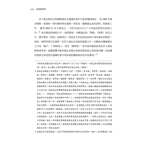 [1] 從1999年歲末開始,我和一群年輕的學生展開一項名為「臺灣童乩基本資料」的調查工作,截至2003年12月底為止,共計完成五百九十六個童乩的初步訪談工作。在這過程之中,不少童乩對於訪談都抱持排拒的態度,因此,工作並不是進行得很順利,但也大致完成其社會背景和主要宗教歷程的資料收集。可惜的是,除了少數例外,訪談的場合都不是在廟會,因此,較少對其儀式裝扮和演示進行詢問,即使提問,也很少獲得回應。