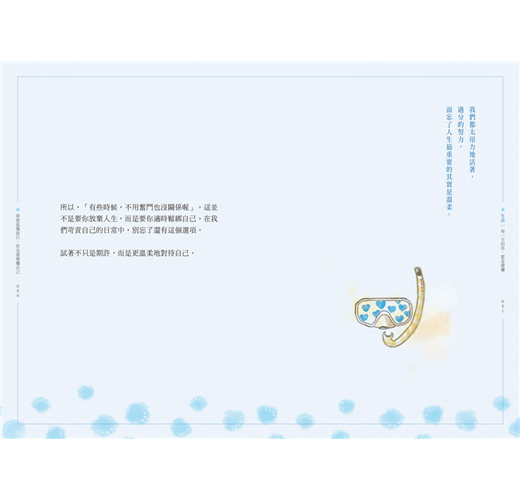 所以,「有些時候,不用奮鬥也沒關係喔」。這並不是要你放棄人生,而是要你適時鬆綁自己。在我們苛責自己的日常中,別忘了還有這個選項。