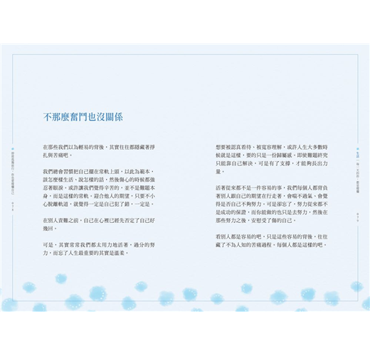 活著從來都不是一件容易的事,我們每個人都背負著別人跟自己的期望在行走著,會喘不過氣、會覺得是否自己不夠努力。可是卻忘了,努力從來都不是成功的保證,而你能做的也只是去努力,然後在那些努力之後,安慰受了傷的自己。