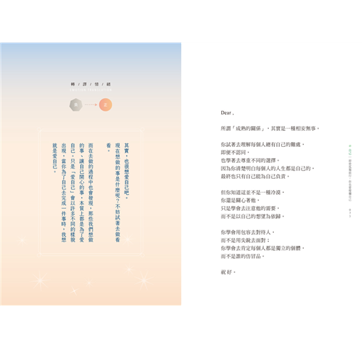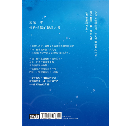 這是一本懂你情緒的轉譯之書,傾聽你對夢想、自我、生活、愛情的心情,陪伴你在漫漫日常的征途裡,以自己喜歡的步伐,成為自己喜歡的模樣。