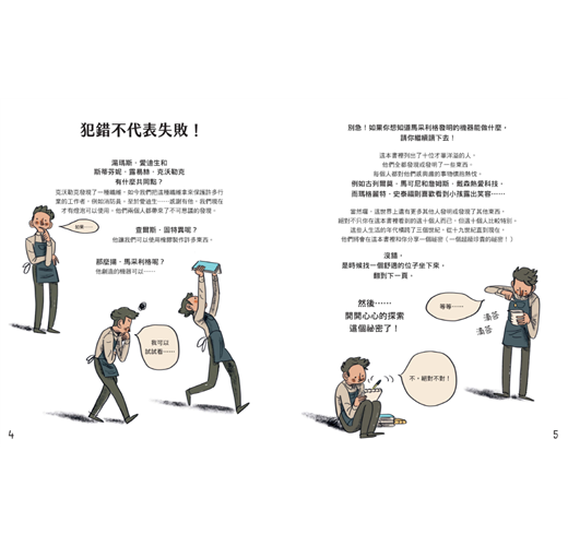 這本書列舉了十位偉大發明家「犯錯」的故事,讓我們知道,「犯錯」並不是什麼大不了的事,反而是通往成功的必要條件。犯錯時,他們除了不輕易放棄之外,更不會讓自己被其他人的看法或話語影響。
