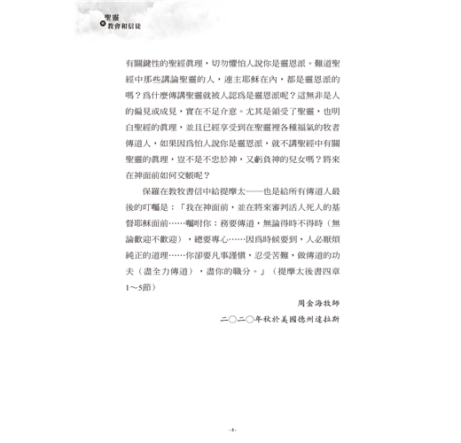 今日教會中較少有人傳講聖靈,或著書論聖靈,有些教會領袖似乎故意避免講論聖靈,甚至還有教會禁止人在聚會中有任何所謂靈恩派的表現,因為怕人說他們是靈恩派,或怕有些不接受靈恩的信徒因此就不來教會了。這種懼怕無疑是出於那惡者撒但,使得許多神的兒女失去了父神在聖靈裡──即在基督裡,所要賜給他們各樣屬靈的福氣。因此,我們必須追求真理,以真理來攻破撒但的詭計和謊言。主說:「你們必曉得真理,真理必叫你們得以自由。」(約翰福音八章32節)