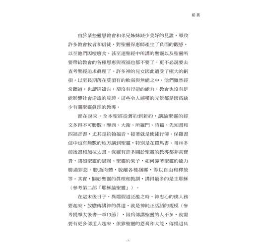 實在說來,全本聖經從舊約到新約,講論聖靈的經文多得不可勝數;摩西、大衛、所羅門、詩篇、先知書和四福音書,尤其是約翰福音,接著就是使徒行傳。保羅書信中也有無數的地方講到聖靈,特別是在羅馬書、哥林多前後書和加拉太書。保羅有許多關於聖靈的教導都非常寶貴,諸如聖靈的恩賜、聖靈的果子,如何靠著聖靈的能力勝過罪惡、勝過肉體,脫離各種捆綁,得以自由和釋放等。其實,關於聖靈的真理和教訓,講得最多的是主耶穌(參考第二部「耶穌論聖靈」)。