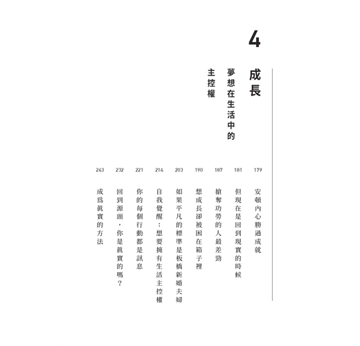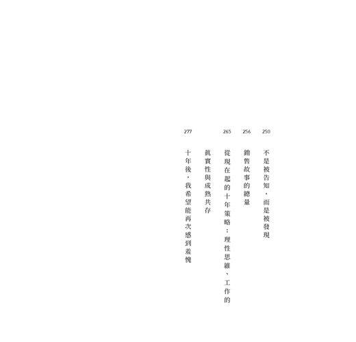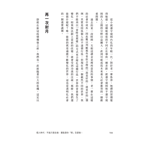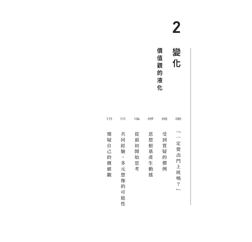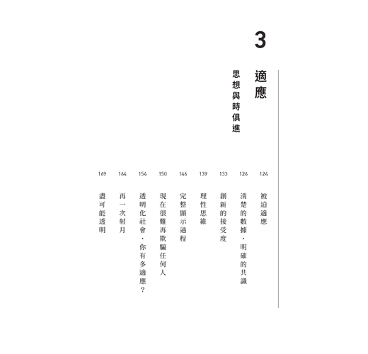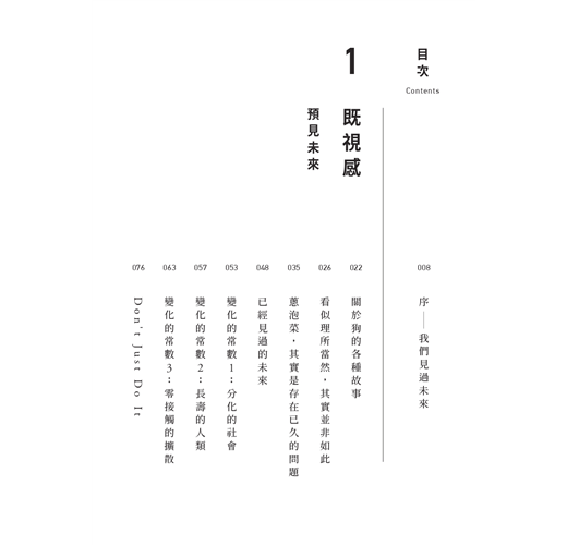 目錄 序|我們見過未來 1 既視感:預見未來 關於狗的各種故事 看似理所當然其實並非如此 蔥泡菜,其實是存在已久的問題 已經見過的未來 變化常數1:分化的社會 變化常數2:長壽的人類 變化常數3:零接觸的擴散 Don't Just Do It 2 變化:價值觀的液化 「一定要出門上班嗎?」 受到質疑的慣例 思想根基產生動搖 從最初開始思考 共同經驗,多元想像的可能性 懷疑自己的價值觀 3 適應:思想與時俱進 被迫適應 清楚的數據,明確的共識 創新的接受度 理性思維 完整顯示過程 現在很難再欺騙任何人 透明化社會,你有多適應? 再一次射月 盡可能透明 4 成長:夢想在生活中的主控權 安頓內心勝過成就 但現在是回到現實的時候 搶奪功勞的人最差勁 想成長卻被困在箱子裡 如果平凡的標準是板橋新婚夫婦 自我覺醒:想要擁有生活主控權 你的每個行動都是訊息 回到源頭,你是真實的嗎? 成為真實的方法 不是被告知,而是被發現 銷售故事的總量 從現在起的十年策略:理性思維、工作的真實性與成熟共存 後記|十年後,我希望能再次感到羞愧