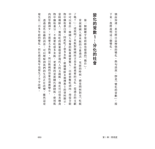 序 我們見過未來 二○一○年初,復古設計的歐式冰箱於韓國上市,即使價格昂貴、性能也不突出,在韓國卻仍深受大眾喜愛。因為獨居人口增加、線上喬遷宴等新傳播型態出現,以及對設計和生活方式的重視等變化,歐式冰箱為傳統白色家電樹立了新的標準。隨著經濟發展幅度減緩,對生活品質的渴求增加,人們開始回顧生活,從盲目遵循傳統價值觀與習俗,轉而重新思考自己與家庭的關係和生活方式,定義出新的準則。個體想適應環境而產生的改變,無異於生物為了生存而奮力拚命的過程,仔細觀察一定能看出一些調整方向。這正是我的工作,我蒐集人...