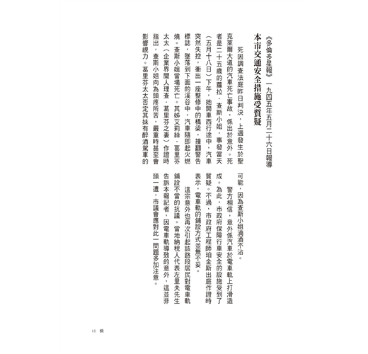 死因調查法庭昨日判決,上週發生於聖克萊爾大道的汽車死亡事故,係出於意外。死者是二十五歲的蘿拉.查斯小姐,事發當天(五月十八日)下午,她開車西行途中,汽車突然失控,衝出一座整修中的橋梁,撞翻警告標誌,墜落到下面的溪谷中,汽車隨即起火燃燒。查斯小姐當場死亡。其姊艾莉絲.葛里芬太太(企業界聞人理查.葛里芬之妻)作證時指出,查斯小姐向為頭疼所苦,嚴重時甚至會影響視力。葛里芬太太否定其妹有醉酒駕車的可能,因為查斯小姐滴酒不沾。