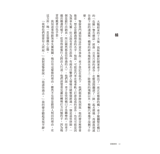 汽車從橋上墜落那一瞬間,如閃亮蜻蜓般懸在半空要往下沉墜的前一剎那,她在想些什麼呢?是想亞歷斯、理查、我們父親、上帝還是她要命的三角關係?抑或是想到以前每天早上她都會藏在我五斗櫃抽屜裡的廉價作業簿?那抽屜是我放襪子用的,所以她知道,我每天早上一定會打開它,看見作業簿。