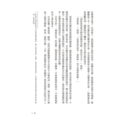我看得見蘿拉那張滑順的鵝蛋臉、盤得整整齊齊的髮髻,甚至看得見她當時穿的衣服:小圓領的襯衫式連衣裙,顏色素淡,若非藏青色或鐵灰色就是醫院牆壁的綠色,總之都是悔罪的顏色。與其說那是她自己挑選的顏色,不如說是她被禁錮於其中的顏色。我看得見她肅穆的淺笑,因驚異而揚起的眉毛,彷彿在讚嘆眼前景色的壯觀。