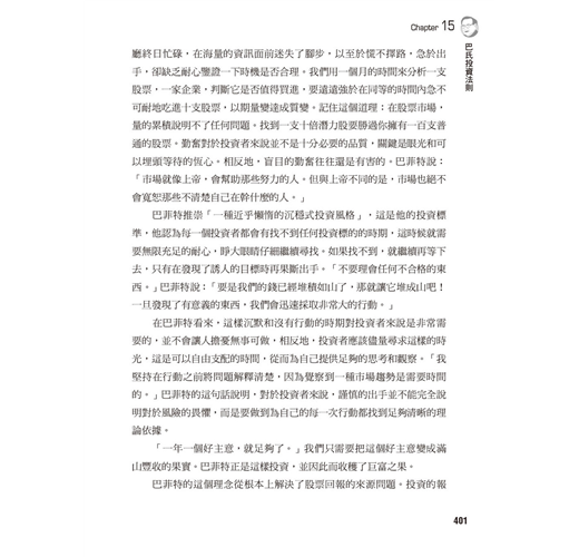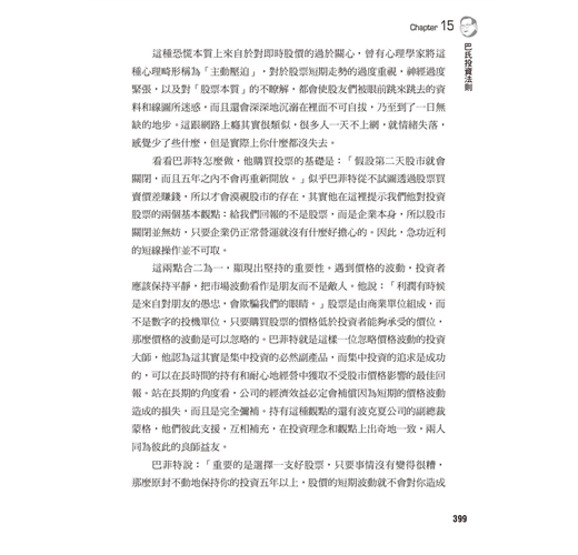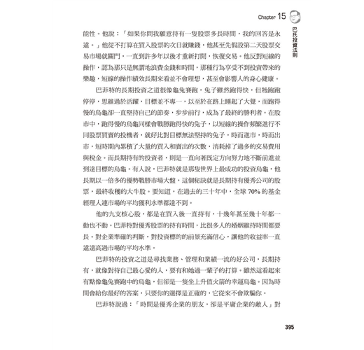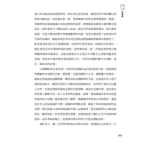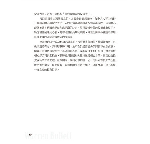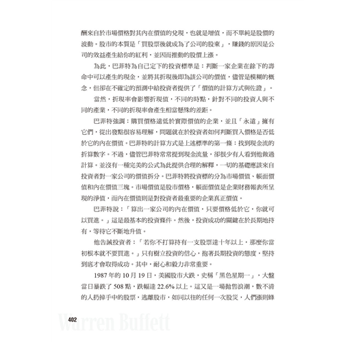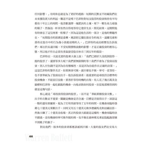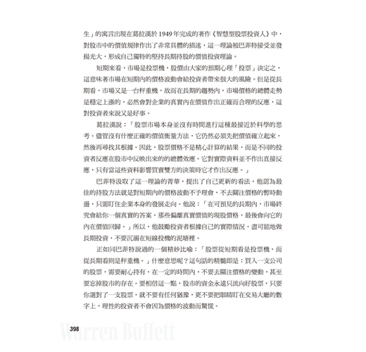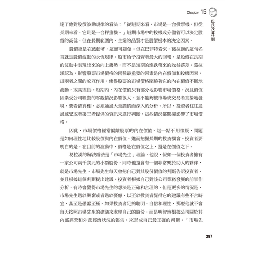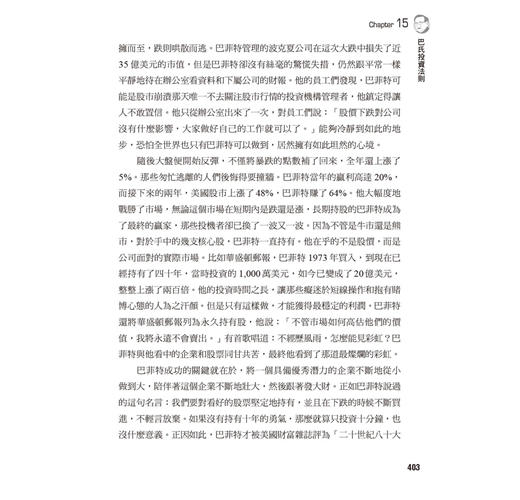 這本書就是讓外行投資者正式成為入門投資人的分水嶺,讀完這本書,就能從股神的故事中得到啟發,用更加成熟的心態去面對投資、了解投資與投機間的最大差異,以此對抗浮躁的市場氛圍,成為一個能夠不受市場左右的優秀投資者。