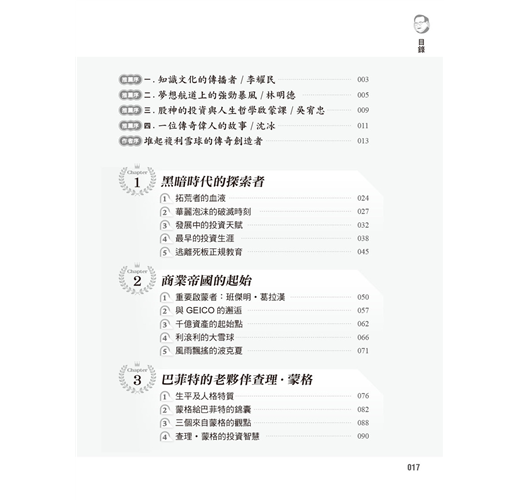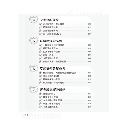 巴菲特的投資生涯可以說是長遠的,他在商業上的榮耀輝煌貫串了漫長的一生。從波克夏開始,他陸續投資了如可口可樂、沃爾瑪、寶潔等成功的項目,這些年的歲月裡,他認識了一個對他來說非常重要的夥伴:一個對他來說亦師亦友的左右手,教會他等待、時刻提醒他保持理智並與他共同奮戰多年的好友查理•蒙格。從蒙格的介紹裡,我們能看見一個造就了了不起的企業家及偉大企業的背後推手究竟有什麼樣的智慧。