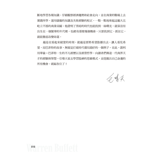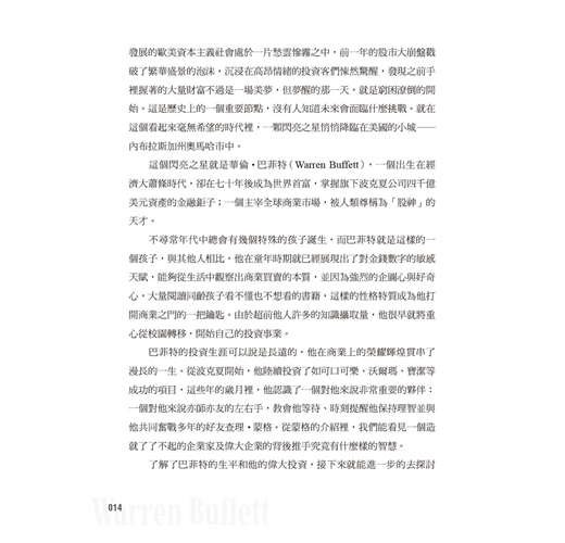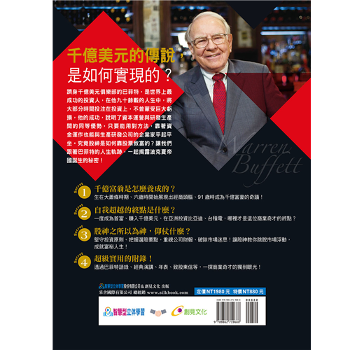 越是在看起來絕望的時刻,就越是要將希望散播出去、讓人看見希望,而巴菲特的故事,無疑是打破時代僵局最好的一個例子。在此,謹利用華倫.巴菲特一生的不凡經歷以及經營哲學,向讀者們傳達一代商界天才的經驗與智慧,引導大家去學習股神的思維模式,並挖掘出自己身邊的所有機會。祝福各位了!