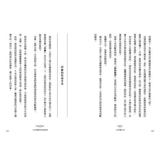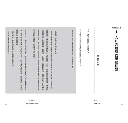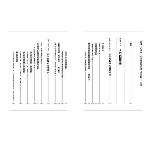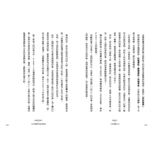 PART1「人的判斷方式」中,會介紹建立印象的過程,以及過程中常見的思考傾向。由接收的資訊建立起印象時,有時會憑直覺判斷,有時則會深思熟慮再判斷。充分瞭解此一現象後,才會正式進入主題。