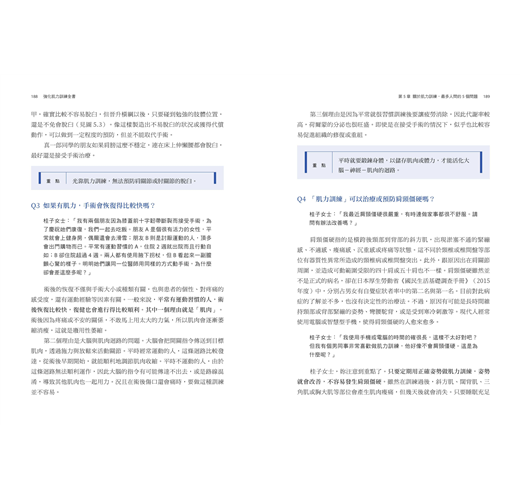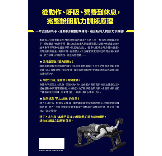 以淺顯易懂的文字,讓讀者可以輕鬆地了解肌力訓練對於預防傷痛和慢性疾病,以及促進健康老化的重要性。──吳肇基,骨科專科醫師、臉書粉絲專頁「大夫訓練」編輯