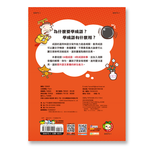 為什麼我要學成語?學成語有什麼用?成語的運用和語文寫作能力息息相關,善用成語可以讓文字精鍊,意蘊豐富,不需要長篇大論便可以讓文意鮮明活絡起來,達到畫龍點睛的效果。本書收錄136個成語,8則成語故事,並加入淺顯易懂的解釋、例句,讓孩子更容易理解,進而靈活運用,達到提升語文素養的終生能力
