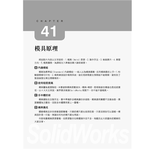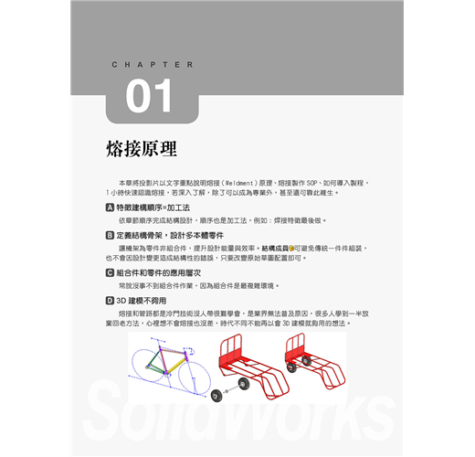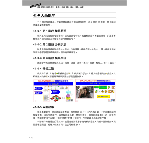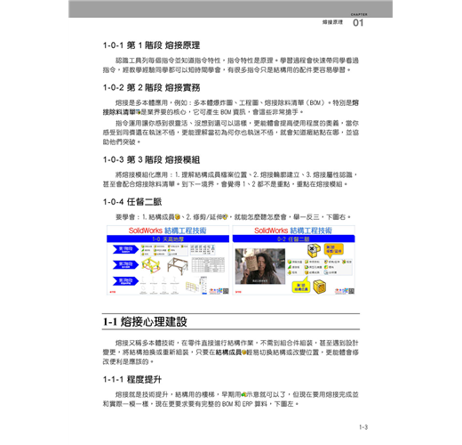 一次擁有業界要的四大製造技術,AI時代來臨勢必帶來改變,3D建模不是優勢,重點在提升SolidWorks使用程度。當別人還在滿足零件、組合件、工程圖建模,你已經是下一境界與工廠製程同步管理工程師。書中內容經實務驗證修改成精華,導入工廠製程管理,全都是業界要的職能指標。現今企業要降低人力提高生產力,模組化正是火紅的需求,本書特別加入設計模組化技術,讓同學更能走向職場巔峰。