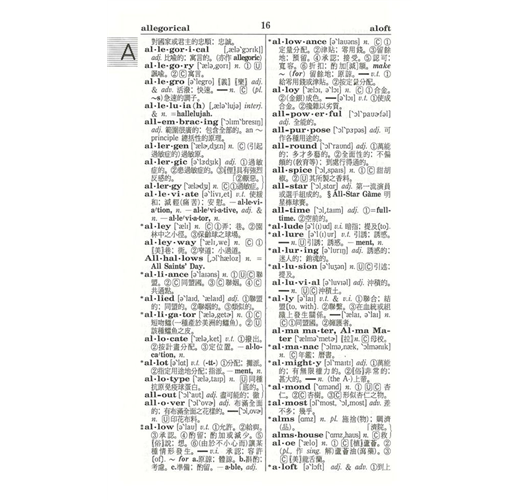 2.英漢部分:英文字彙、成語約60,000餘,常用字加星號*,最常用字加雙星號**,新字新詞最多,名詞並加注[C ][U],以表示可數、不可數。