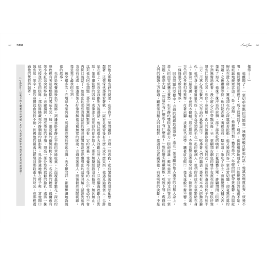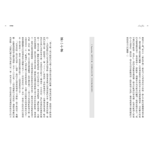 「他伸出手臂,揮向石欄杆外的夜色。我保持冷靜。他牢牢盯著我,眼神嚴厲。錯不了,他在威逼我。而我不能做出任何表示,以免一個手勢或一個字眼就表露出涉及這個事件的致命觀點。我不想冒那樣的風險。別忘了他就在我眼前,而且他太像我們的一份子,不可能不危險。不過如果你們想知道,我不介意告訴你們,我確實匆匆瞄了一眼,估量遊廊前的草坪中央那叢幽暗的灌木跟我距離有多遠。他誇大了。我跳不了那麼遠,落點會差個一兩公尺,而當時只有這件事我可以確定。