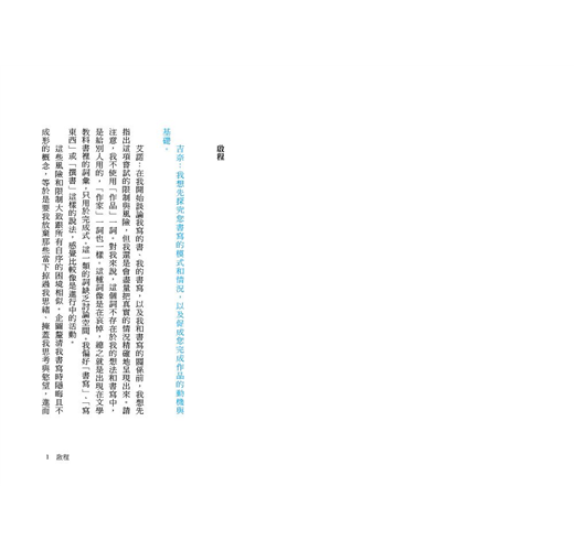 「我透過故事,或是對場景與細節的敘述重現記憶,而那個場景、那些細節和句子就是那份感受的載體。我需要那份感受(或是喚醒對那份感受的記憶),需要它毫無遮掩、赤裸裸地到我面前。然後我才能找到合適的字詞。換句話說,感受是書寫的必要條件,也是建構真實的必要條件。」