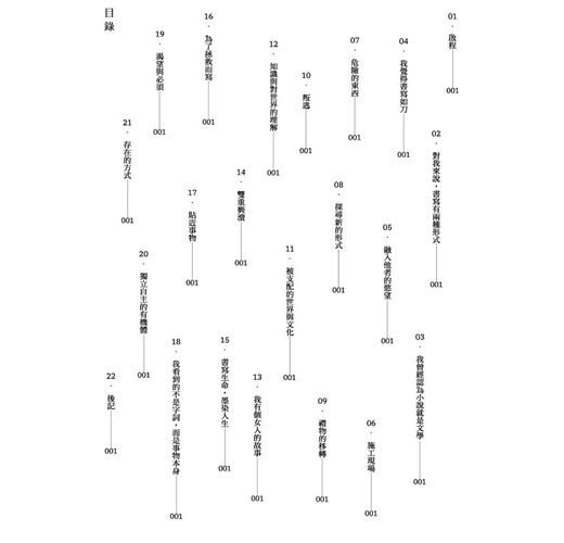 「我個人對文學的想法,是希望每個句子都承載著事實,每個字都不只有語法意義,要能帶來感受和影像。在寫下/閱讀的同時,一字一句都能帶出『牢固』的現實,就像我們用來形容一棟建築時的說法,一點也不『輕盈』。」