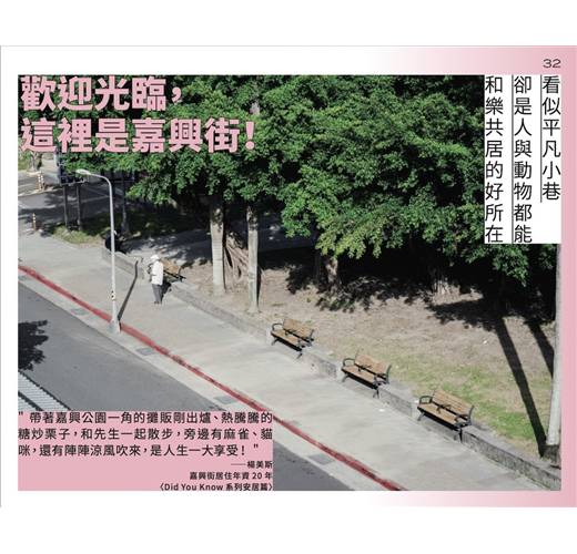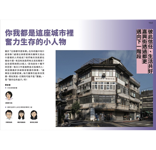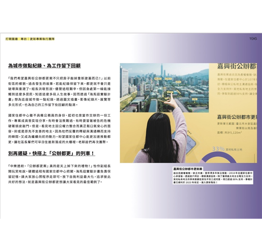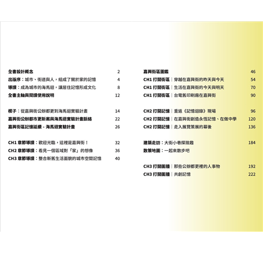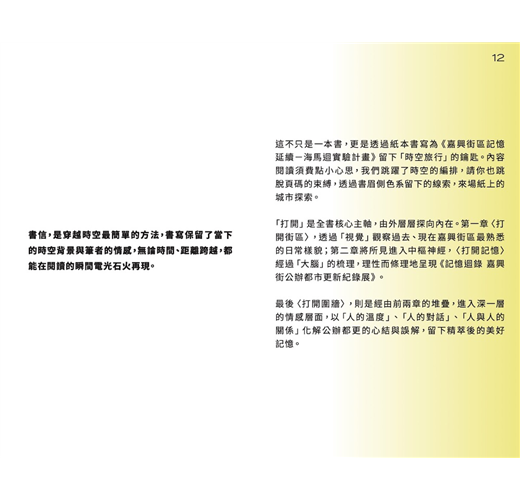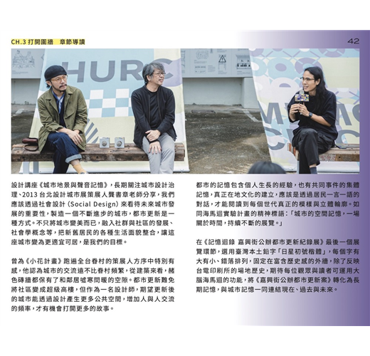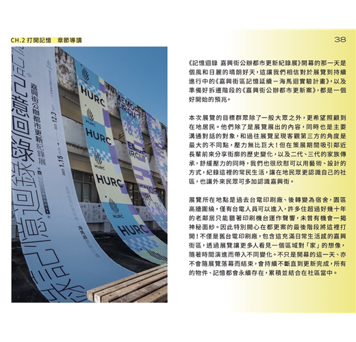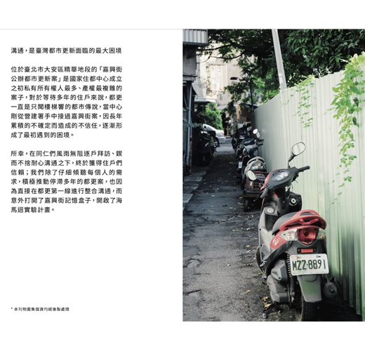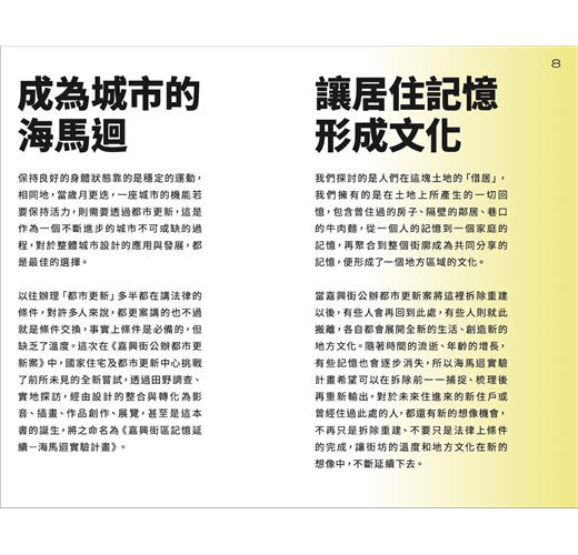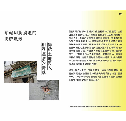 保持良好的身體狀態靠的是穩定的運動,相同地,當歲月更迭,一座城市的機能若要保持活力,則需要透過都市更新,這是作為一個不斷進步的城市不可或缺的過程,對於整體城市設計的應用與發展,都是最佳的選擇。以往辦理「都市更新」多半都在講法律的條件,對許多人來說,都更案講的也不過就是條件交換,事實上條件是必備的,但缺乏了溫度。這次在《嘉興街公辦都市更新案》中,國家住宅及都市更新中心挑戰了前所未見的全新嘗試,透過田野調查、實地探訪,經由設計的整合與轉化為影音、插畫、作品創作、展覽,甚至是這本書的誕生,將之命名為《嘉興街區記憶延續-海馬迴實驗計畫》。