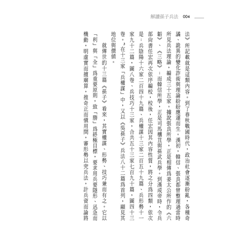 春秋前期周王威勢凌夷,列強交征,主權謀的《孫子》兵法,跨越《周禮》以「九伐之法」正邦國的軍禮傳統,與古《司馬法》講仁義的人道精神,公然標舉「勝」與「利」為用兵宗旨,要求用兵要爭勝、得利、求全。全書十三篇6000多字,精要深入地開啟中國兵學從整體規劃,到權謀、形勢、技巧全備的理論體系,為中國兵學理論開展新頁。2400多年後,重讀《孫子》兵法,所獲益的不只是實際競場上的策略與戰術,更是人生各時空場域,可以無限轉化、再生的有機養分與智慧能量。