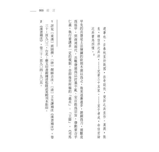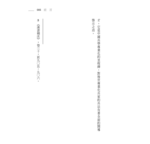 被推為兵權謀正宗的《孫子》兵法,遠在二千四百~二千五百年前的春秋前期,因著周王室威勢凌夷,列國豪強交征爭勝時代的來臨,跨越《周禮》以「九伐之法」正邦國的軍禮傳統,與古《司馬法》仁義道德的人道精神,公然標舉「勝」與「利」為用兵的宗旨與原則,要求用兵要爭「勝」、致「利」、求「全」。它在十三篇約六千字左右的有限篇幅中,既精要又深入地開啟了中國兵學從整體規劃,到權謀、形勢,乃甚至是技巧的全幅架構與理論體系,為中國的兵學理論的建置開展了新頁。在它的建構下,兵學不再依附於古貴族軍禮堂堂正正的範限,而開展出中國...